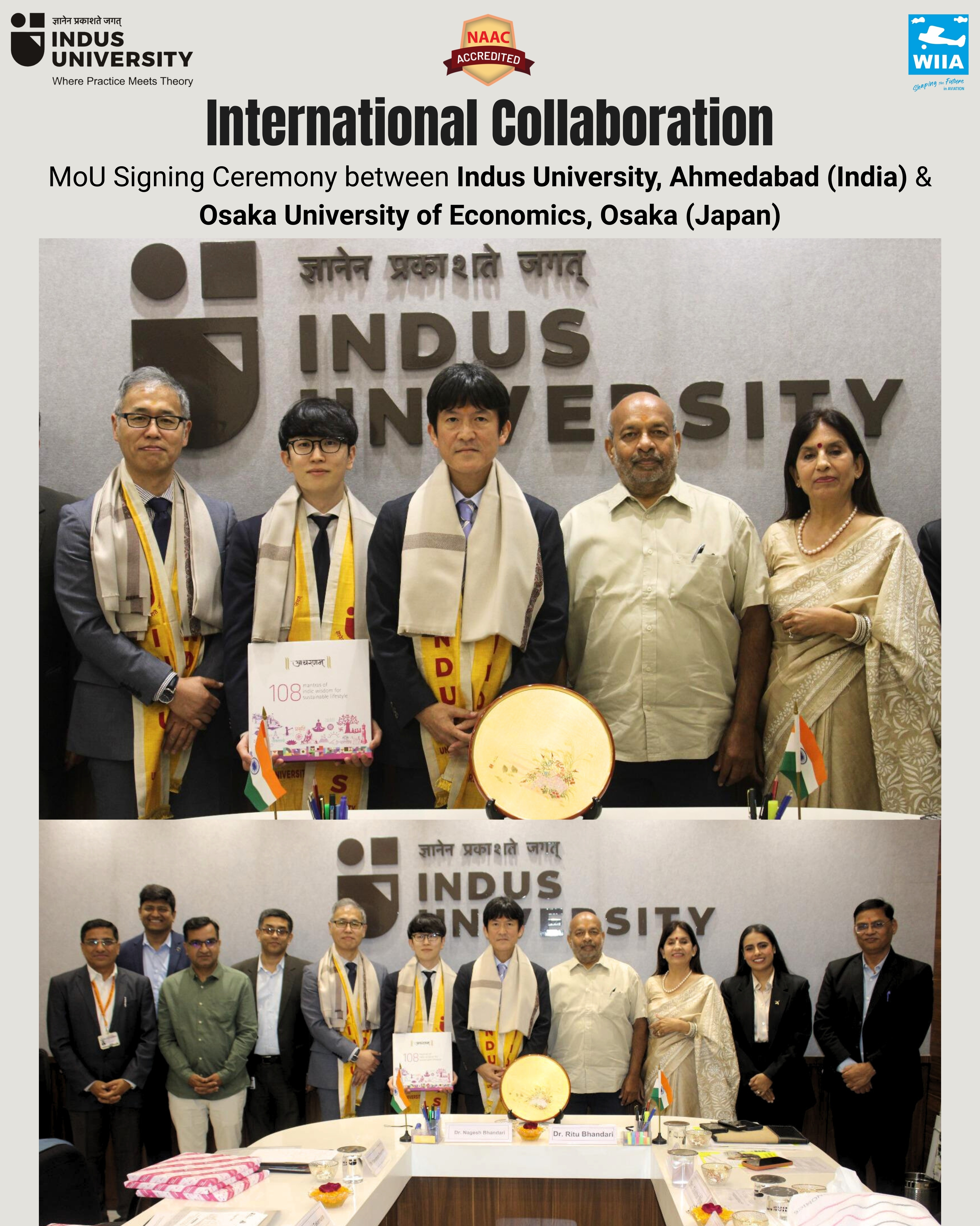 Indus University proudly hosted the International Collaboration MoU Signing Ceremony between Indus University, Ahmedabad (India) and Osaka University of Economics, Osaka (Japan) on 23 February 2026, marking a significant milestone in strengthening global academic partnerships and fostering international cooperation in higher education. International Academic Partnership: Indus University, Ahmedabad (India) Osaka University of Economics, Osaka (Japan) The Memorandum of Understanding (MoU) was formally signed by Dr. Ritu Bhandari, President – Indus University, and Dr. Shunichiro Yamamoto, President – Osaka University of Economics, in the esteemed presence of distinguished dignitaries and academic leaders from both institutions. Dignitaries Present: The ceremony was graced by Dr. Ritu Bhandari, Honorable President, Indus University; Dr. Nagesh Bhandari, Honorable Associate President, Indus University; Dr. Shunichiro Yamamoto, Honorable President, Osaka University of Economics; Dr. Yoshiaki Takemura, Associate Professor, Osaka University of Economics; Mr. Naoya Asada, Administrative Officer, Osaka University of Economics; Mr. Shekhar Vyas, BOG Member, Indus University; Prof. (Dr.) Sandeep Chakravorty, Honorable Executive President, Indus University; Dr. R. K. Singh, Registrar, Indus University; Dr. Suketu Jani, Deputy Registrar, Indus University; Dr. Ritendra Sharma, Head, Centre for Indic Studies; Ms. Radhika Bhandari, Director, WIIA & Dean IATE, Indus University; and Dr. Mahesh Gogate, Assistant Professor, Centre for Indic Studies. This partnership reflects Indus University’s continued commitment to expanding international engagement and creating transformative global learning experiences for its academic community.